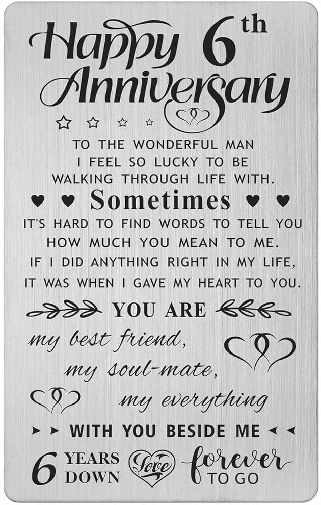 Reaching the six-year milestone in your marriage is a testament to the love and strength shared between you and your husband. It’s a journey that’s been filled with shared memories, laughter, and perhaps a few challenges that you’ve overcome together. This anniversary is a perfect opportunity to express your heartfelt emotions and appreciation for the man who stands by your side.