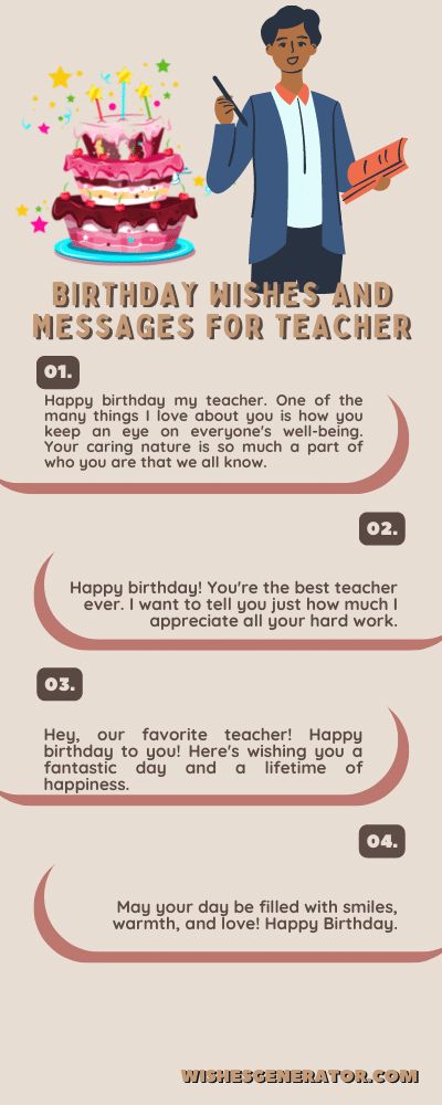 - Wishing you a very happy birthday! You are an amazing teacher and I am lucky to have you in my life. May your day be filled with love, joy, and happiness.