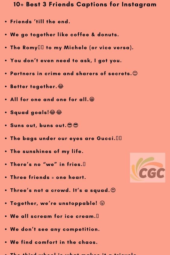 âwhy is it that whenever anything happens, itâs always you three?â 9. Web captions for three best friends. Weâve divided this massive collection into numerous categories to make it easier for you to find your favorite captions for 3 friends.